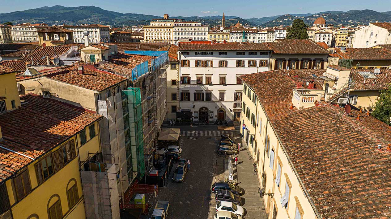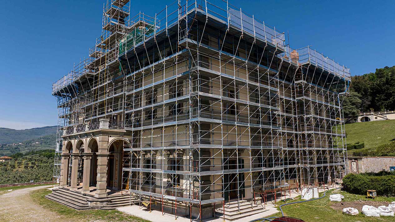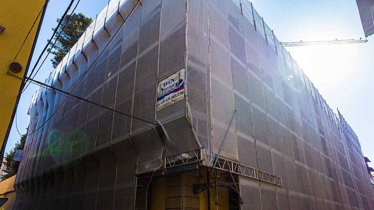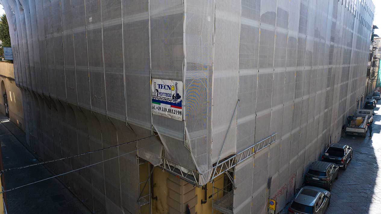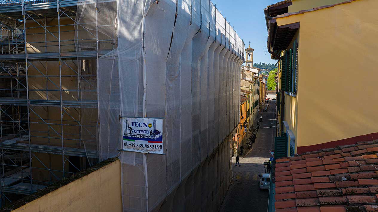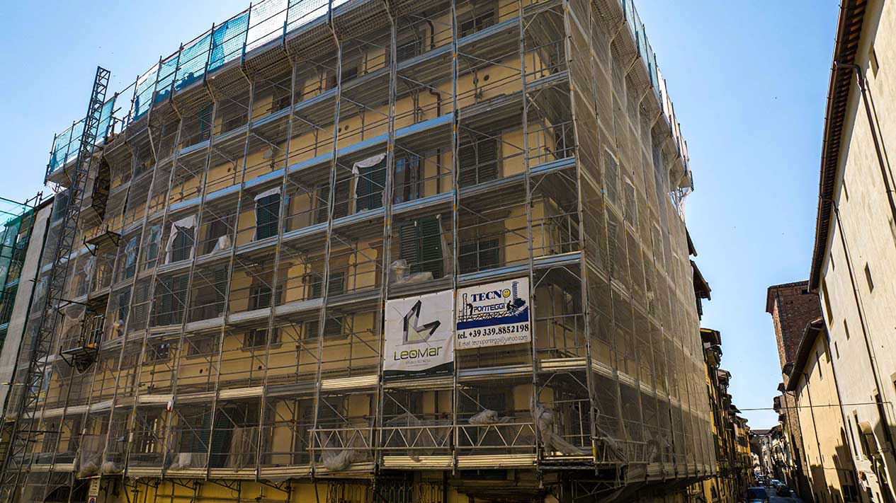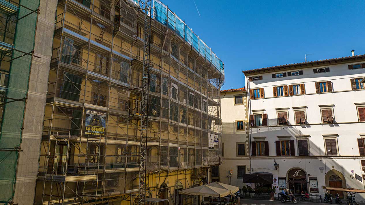 Ponteggi completi per intervento di ristrutturazione delle facciate di un palazzo storico fiorentino.