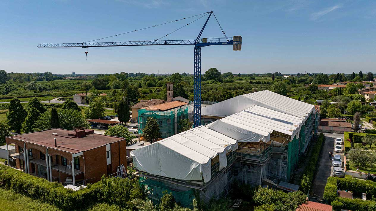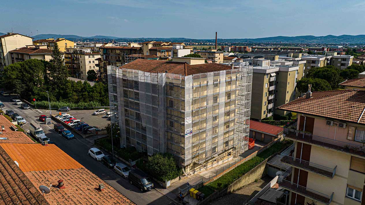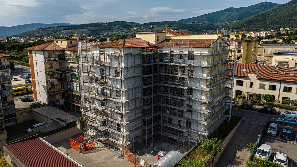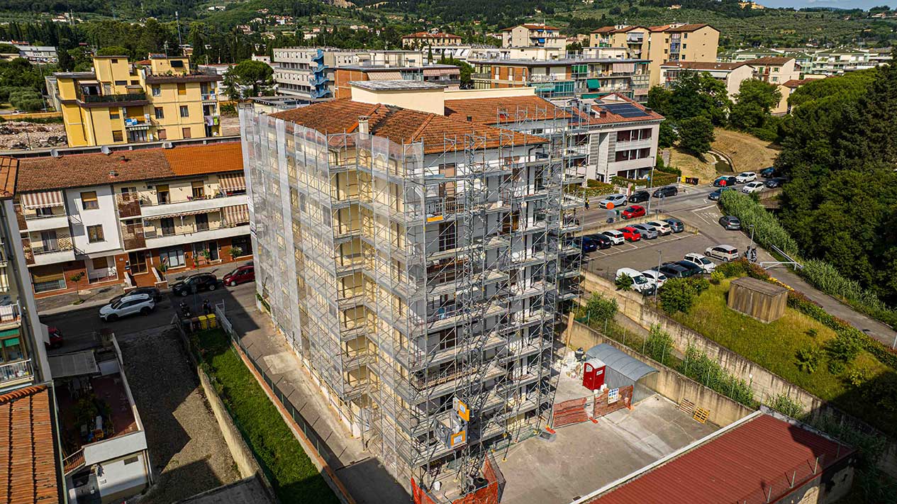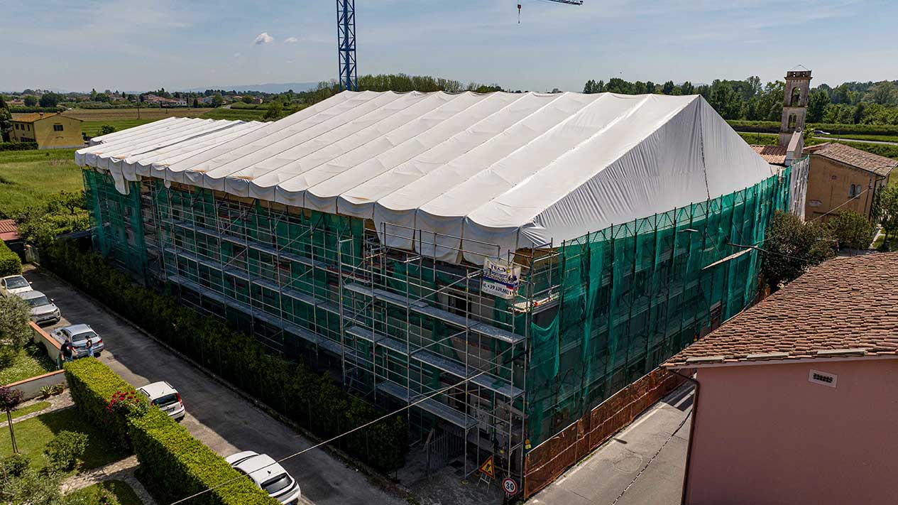 Grande cantiere con ponteggi e coperture per un importante intervento nella zona periferica di Pisa.
