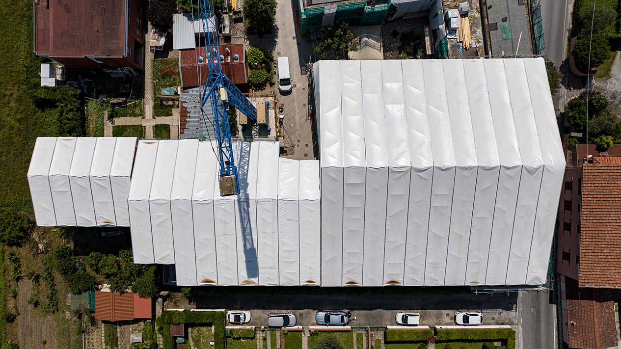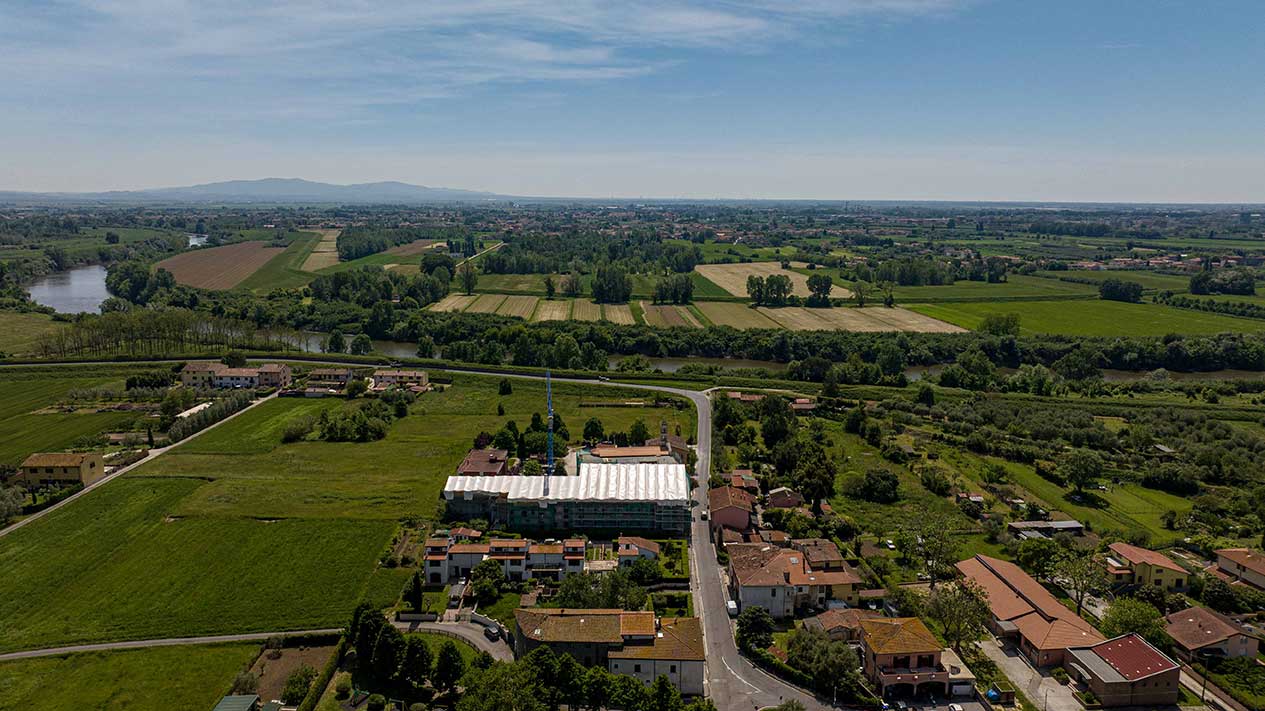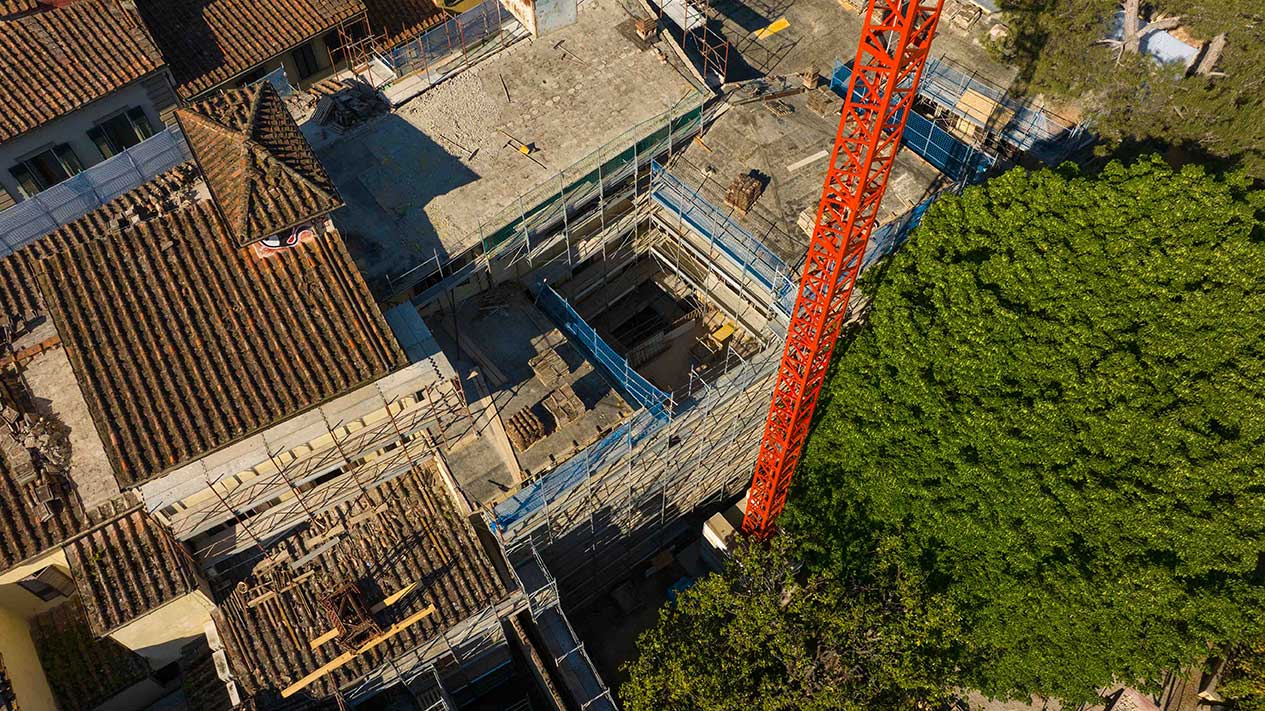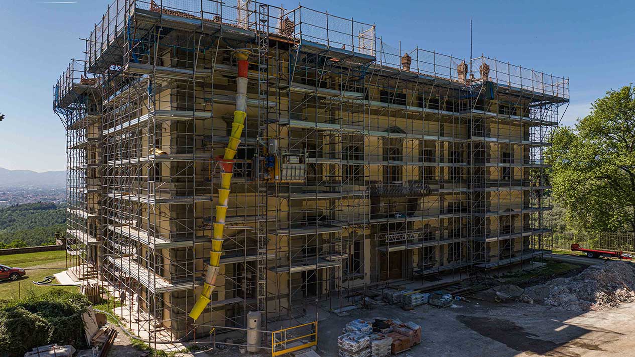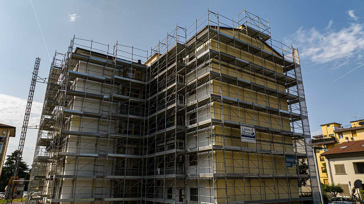 Grande cantiere con ponteggi e coperture per un importante intervento nella zona periferica di Pisa.
